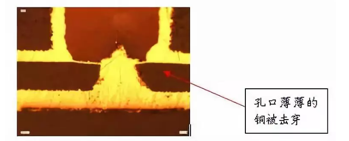 目前在行業(yè)通行的標(biāo)準(zhǔn)(IPC-650)里面,似乎還沒有給出對(duì)于樹脂塞孔的孔上面銅厚的要求,潛在的風(fēng)險(xiǎn)是,一旦樹脂塞孔的孔上面電鍍的銅厚偏薄,經(jīng)過內(nèi)層HDI線路的表面處理,棕化處理以后,孔口上面的薄薄的銅會(huì)有被激光鉆孔鉆穿的可能,而且在電測(cè)試時(shí)是無法判定其有問題的。但這層薄薄的銅在耐高壓等方面的品質(zhì)著實(shí)讓人擔(dān)憂。